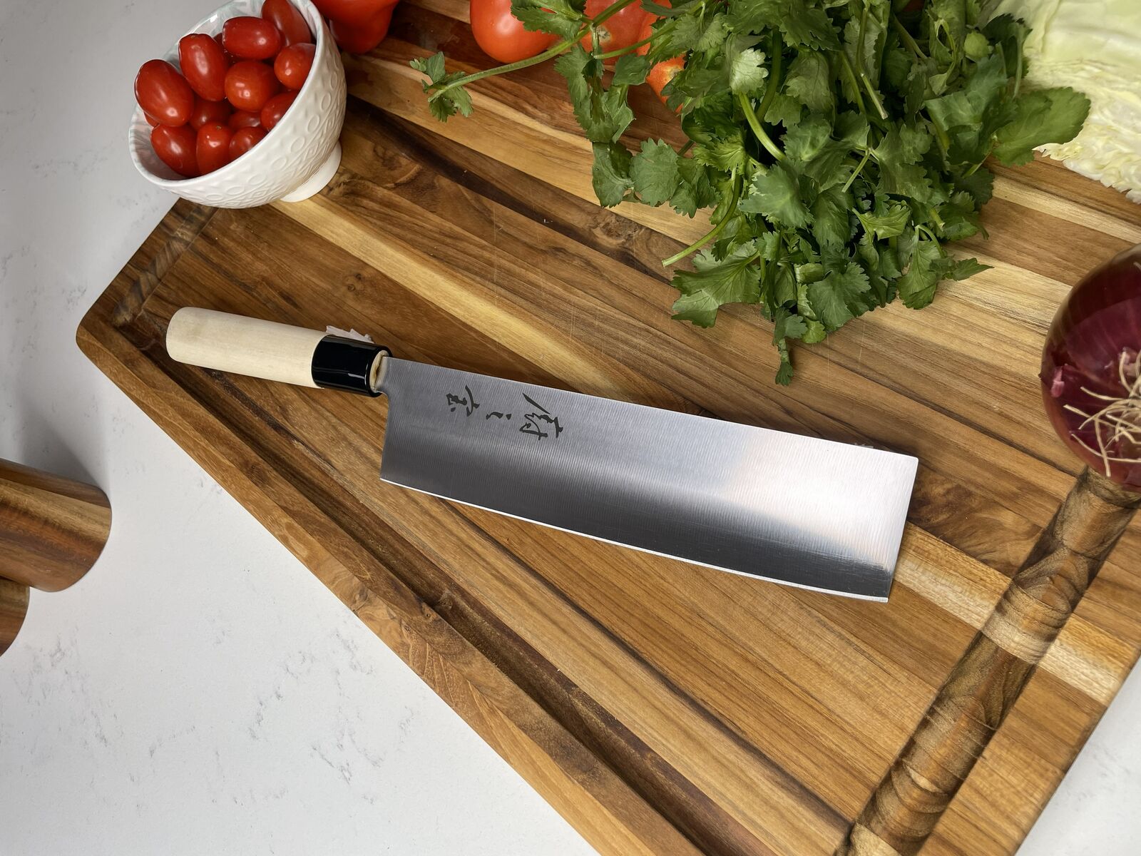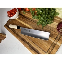 The Japanese inspired Atlantic Cut Usuba knife features a beautiful 21cm blade, designed for precision vegetable preperation. The Usuba knife is renowned for its ability to create straight, clean cuts, making it essential for thin slicing and intricate garnishing. The ergonomic wooden handle provides comforte and precision in the users hands, reducing fatigue and enhancing overall efficency.